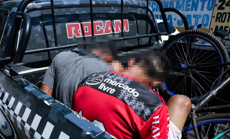 “Estávamos na região da zona Leste quando populares informaram que haviam dois jovens que estavam pichando nos muros de uma rua, com a sigla de uma facção. No local, já encontramos eles sentados na praça e os muros já pichados”, informou o soldado Renato Oliveira, da Rocam.