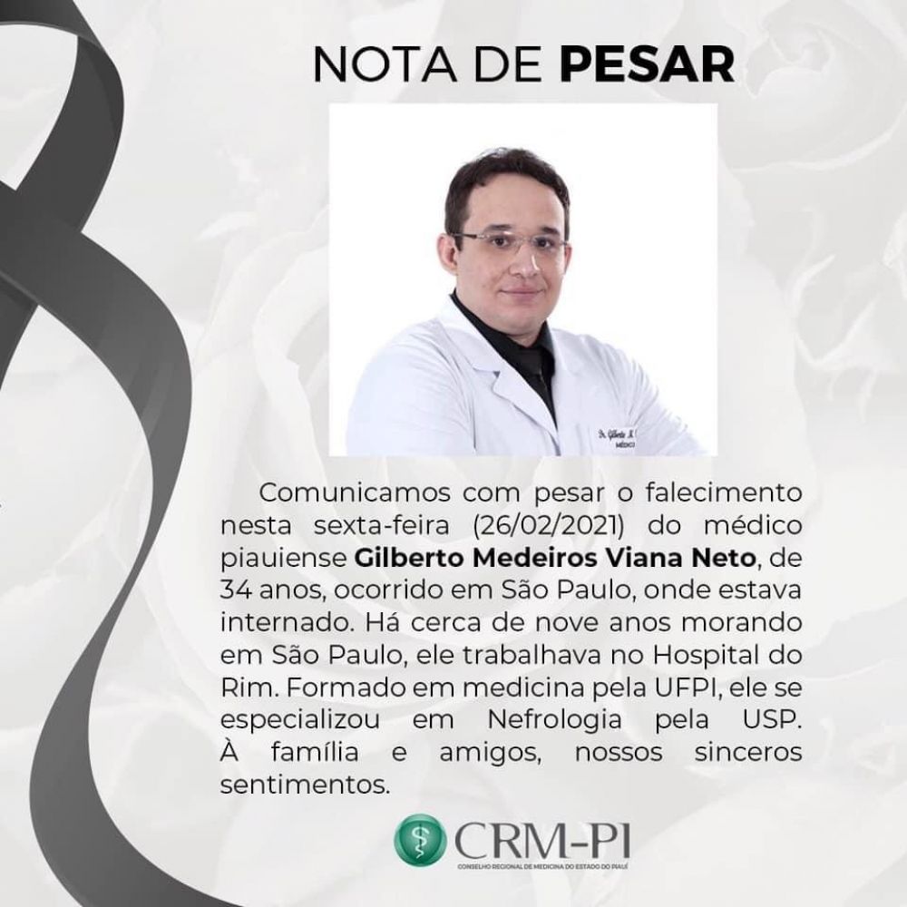 Segundo o Conselho Regional do Piauí (CRM-PI), a Gilberto morava na capital paulista há nove anos e trabalhava atualmente no Hospital do Rim (HRIM).