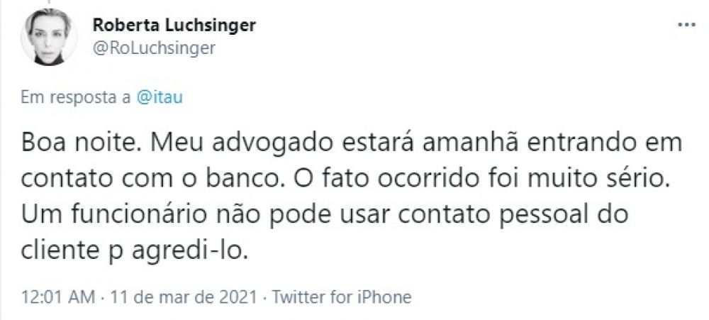 “Meu advogado estará amanhã entrando em contato com o banco. O fato ocorrido foi muito sério. Um funcionário não pode usar contato pessoal do cliente para agredi-lo”.