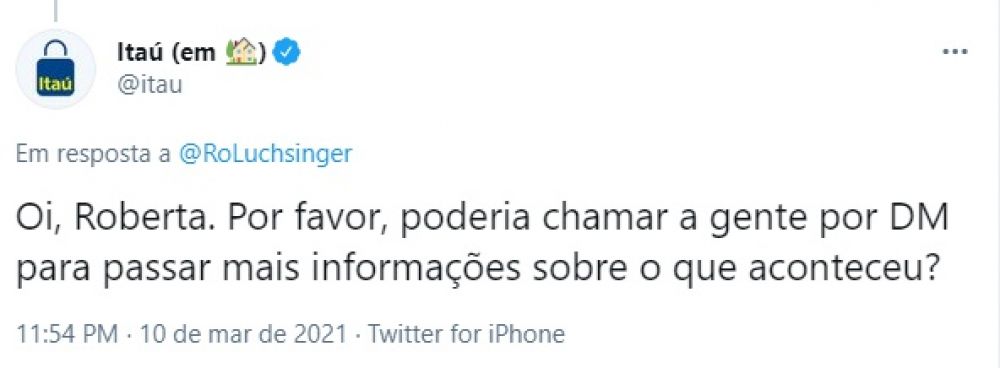 “Gostaria de saber se o Itaú apoia que seus gerentes agridam os clientes do banco sem menor motivo através de WhatsApp?”, perguntou ela.