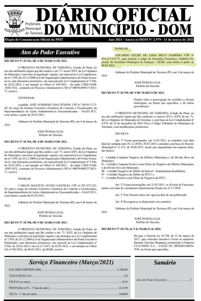 Através do decreto n° 20.708, de 9 de março de 2021, e publicado hoje no Diário Oficial do Município, o prefeito de Teresina, Dr. Pessoa (MDB), nomeou como secretário executivo da prefeitura o economista e ex-vereador de Piracuruca, Eduardo Felipe de Lima Melo Sampaio.