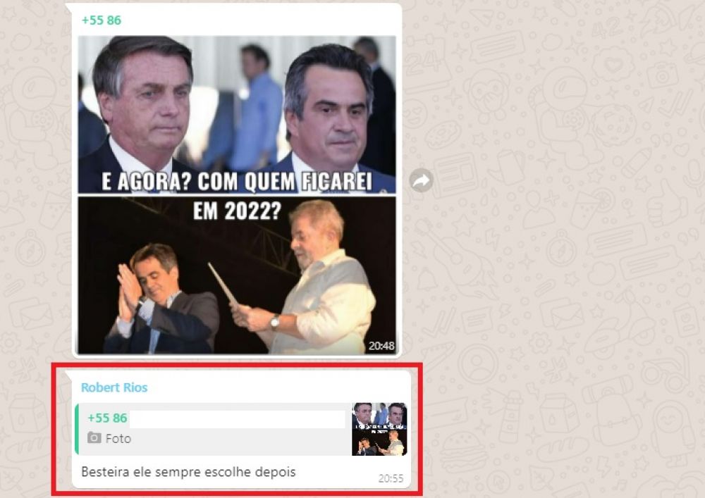 Nesta semana, em um grupo de WhatsApp, canal por onde Robert Rios mais se comunica, um jornalista publicou uma imagem do senador Ciro Nogueira ao lado de Lula e outra ao lado de Bolsonaro. Na imagem, um texto indaga: “E agora? Com quem ficarei em 2022?”. De imediato Robert respondeu: “Besteira, ele sempre escolhe depois”.