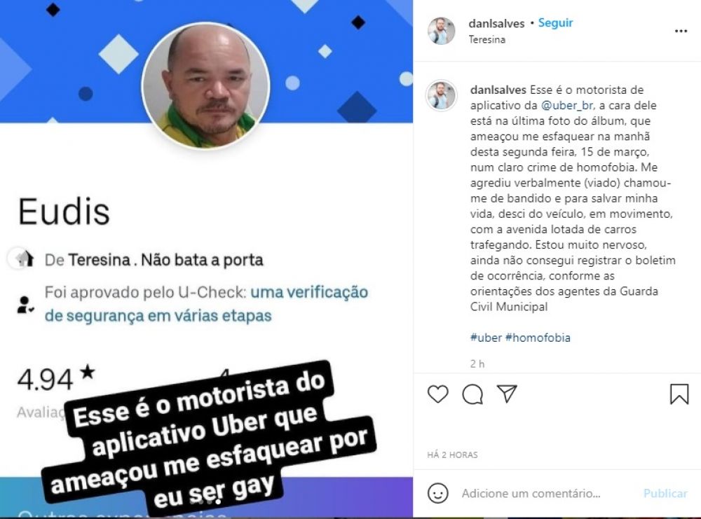 O jornalista Danilo Alves, assessor de imprensa do Governo do Piauí, usou suas redes sociais para denunciar um motorista da Uber, que segundo ele, o agrediu verbalmente e ameaçou de esfaqueá-lo.
