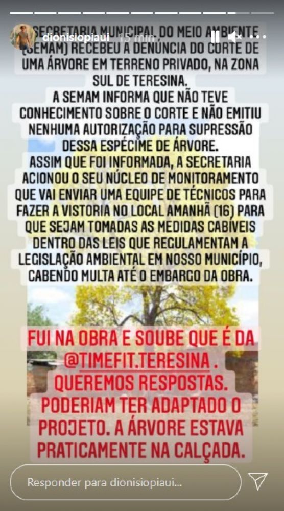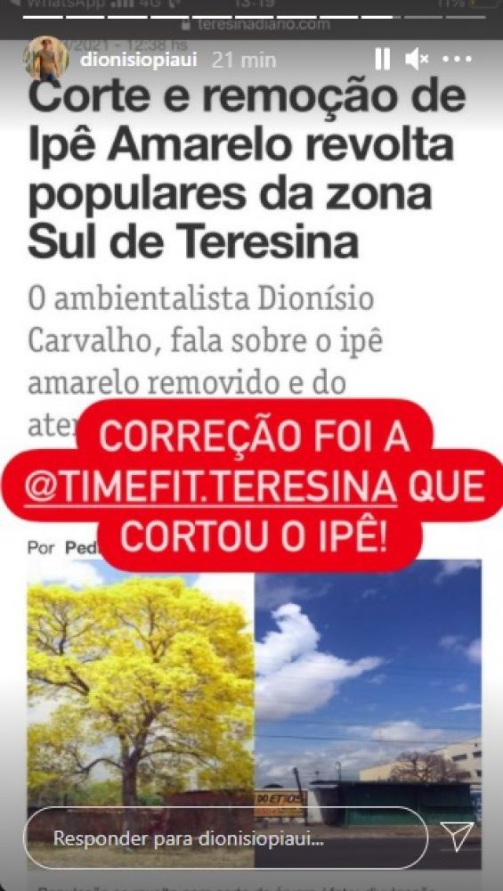 O ambientalista Dionísio Neto, ex-secretário de Meio Ambiente de Teresina, denunciou através de suas redes sociais, que a academia Timefit Teresina, derrubou neste final de semana um ipê amarelo, que ficava localizado na Avenida Barão de Gurguéia, na zona Sul da capital.