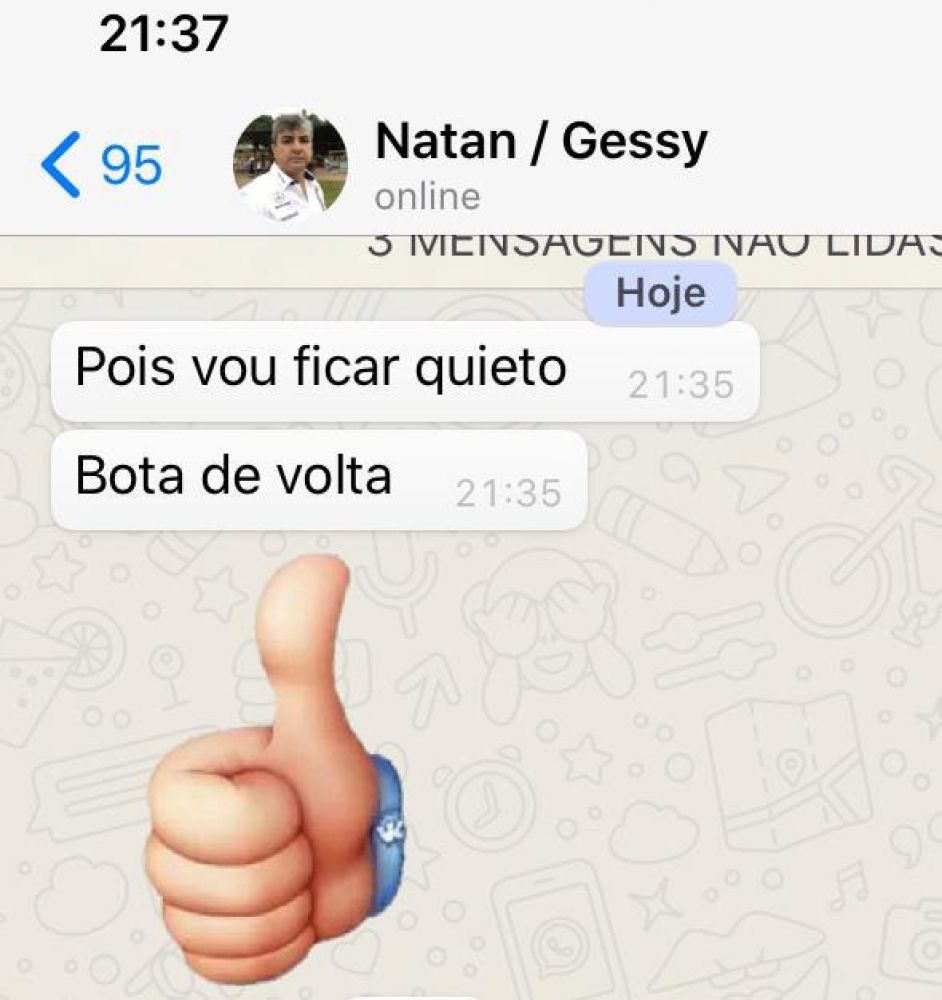 Pouco depois, o administrador compartilhou um print de uma conversa com o empresário Natan Fonseca, onde ele diz que vai ficar quieto.