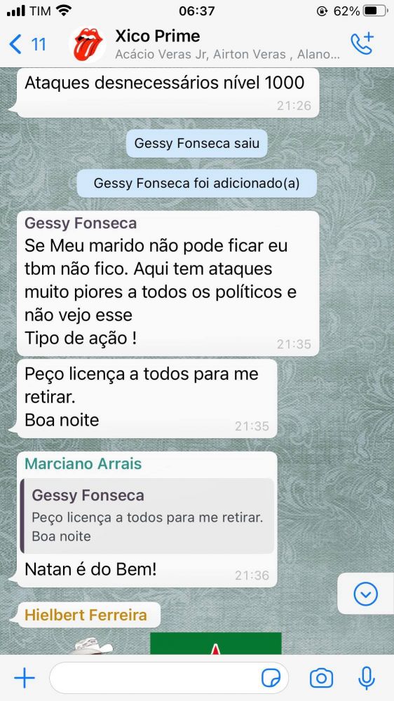 Antes de sair do grupo, o esposo de Gessy, o empresário Natan Fonseca, postou uma foto do governador e fez críticas descabidas e fora da realidade. Com isso, o administrador removeu o empresário e disse que os ataques eram desnecessários.