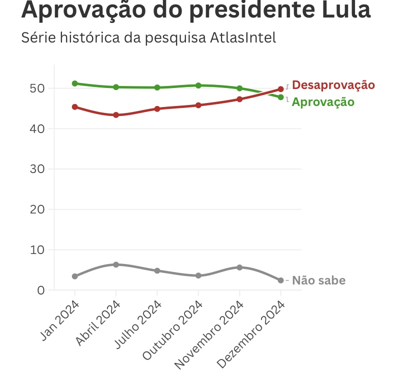 - De acordo com a pesquisa AtlasIntel, Lula tem 49,8% de rejeição e 47,8% de aprovação;