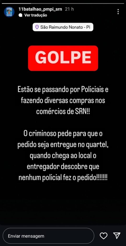 Policiais militares do 11º Batalhão de São Raimundo Nonato usaram as redes sociais para alertar sobre um golpista que estaria se passando por membro da corporação para aplicar golpes em supermercados da região. Pelo menos um comerciante foi vítima da prática, segundo a polícia.