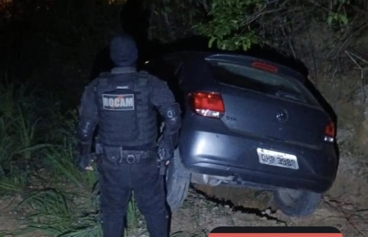 Os policiais notaram um motoqueiro em alta velocidade batendo no vidro de um VW Gol e decidiram abordar os veículos. Ao receberem ordem de parada, ambos fugiram. O motociclista foi alcançado logo à frente, enquanto o carro entrou em uma rua não pavimentada, perdeu o controle e colidiu com um barranco.