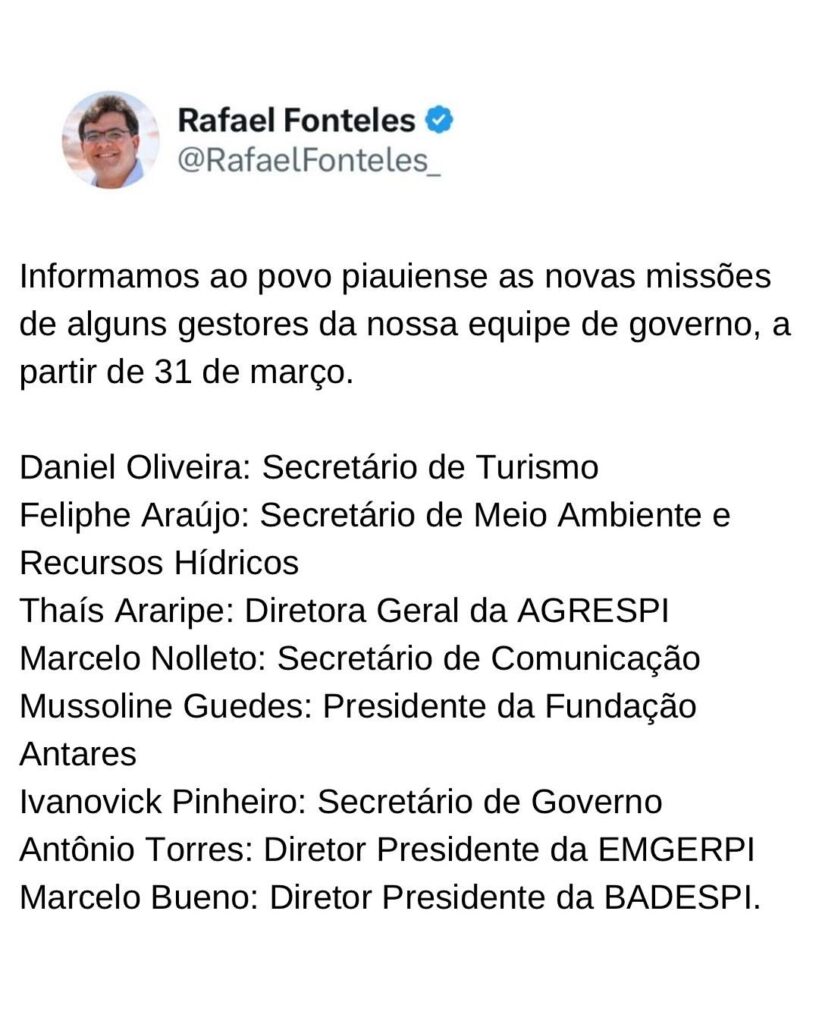 O governador Rafael Fonteles anunciou no fim da tarde desta sexta-feira (28), reformulações no secretariado do governo do Piauí. A mudança de gestores ocorre a partir do dia 31 de março.