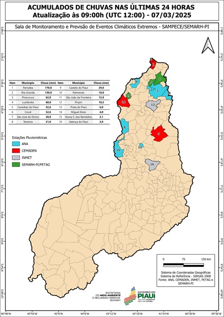 Além de Parnaíba, outras cidades do litoral do Piauí também registraram altos volumes de chuva. Confira os acumulados nas últimas 24 horas: