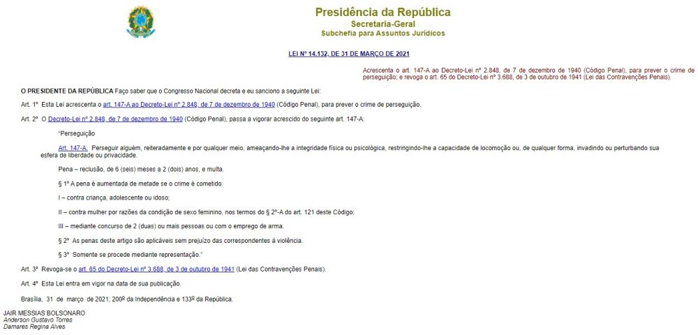 O presidente da República Jair Bolsonaro (sem partido), sancionou a lei 14.132/21 (PL 1.369/19) que tipifica no Código Penal o crime de perseguição, prática também conhecida como “stalking”. A norma foi publicada em edição extra do Diário Oficial da União desta quarta-feira (31).