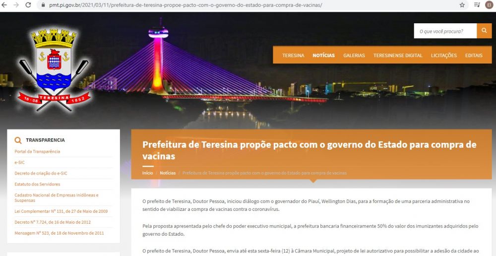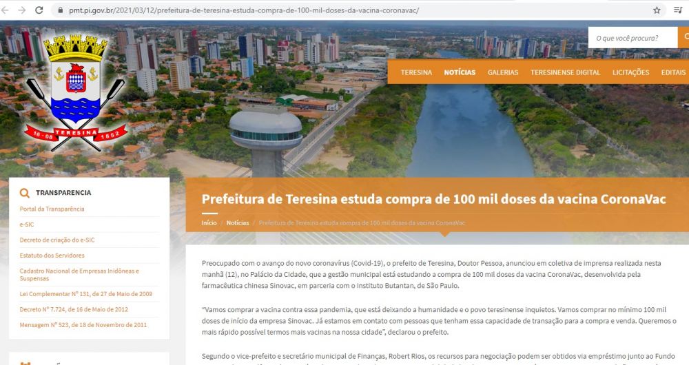 Em 11 de março, o prefeito de Teresina, Dr. Pessoa (MDB), usou a imprensa para passar a ideia de que estaria empenhado em adquirir vacinas contra a Covid-19. Na oportunidade, desafiou o Governo do Estado ao propor uma compra compartilhada. Seriam 100 mil doses exclusivamente para os teresinenses.