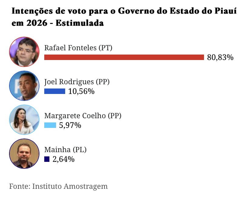 O instituto sondou um cenário com quatro possíveis candidatos ao Governo do Estado em 2026, em uma pesquisa estimulada. Rafael Fonteles aparece na frente, com 80,83%, seguido de Joel Rodrigues (PP), com 10,56%, Margarete Coelho (PP), com 5,97%, e Mainha (PL) com 20,64%.