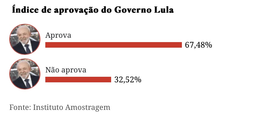 Em relação ao presidente Lula, 67,48% aprovam o governo e 32,52% não aprovam.