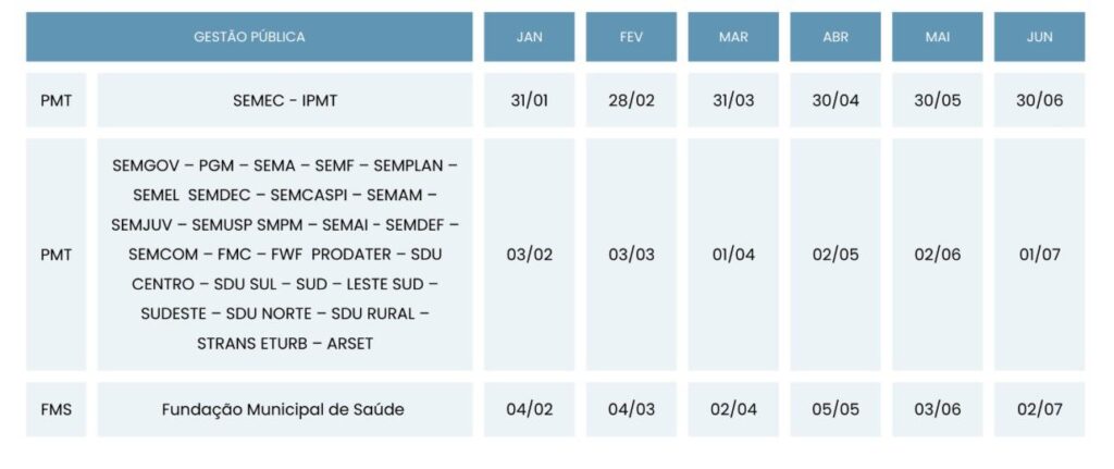 De acordo com a tabela de pagamento dos servidores, a Secretaria Municipal de Educação (SEMEC), já está com os valores creditados em conta. As demais secretarias terão seus vencimentos antecipados já no dia 1º de maio. De acordo com o Executivo municipal, no Dia do Trabalhador, o servidor público municipal contará com dinheiro no bolso para aproveitar o feriado de forma mais segura e tranquila.
