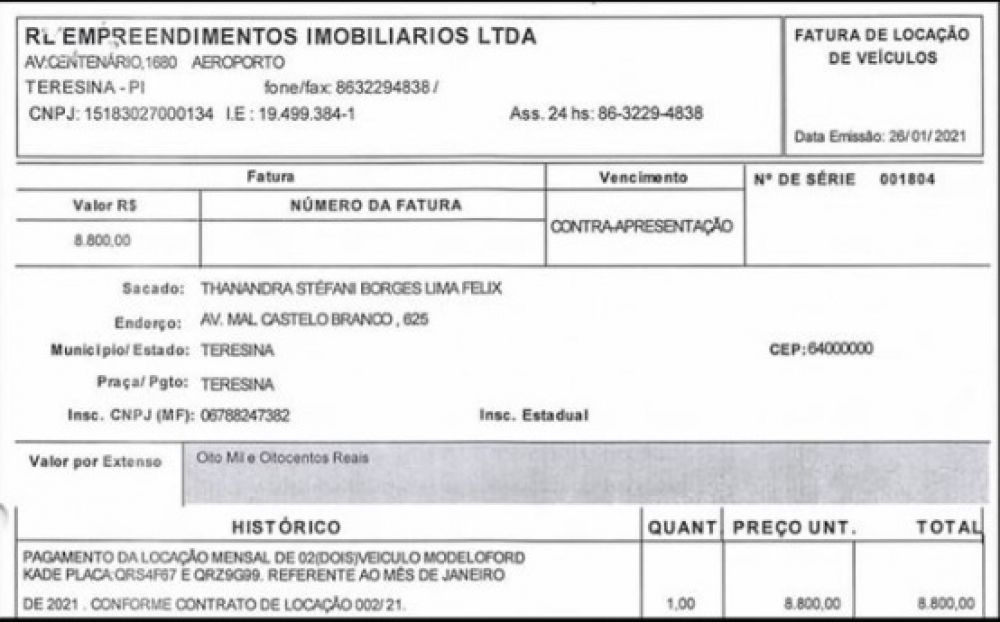 A vereadora de Teresina, Thanandra Sarapatinhas (Patriota), alugou no mês de janeiro de 2021, período em que a Câmara Municipal esteve fechada, dois veículos modelo Ford Ka pelo valor de R$ 8.800, ou seja, pelo período de 30 dias, ela pagou R$ 4.400 em carro modelo popular.
