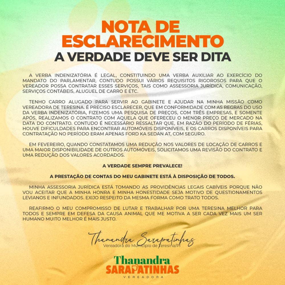 “Tenho carro alugado para servir ao gabinete e ajudar na minha missão como vereadora de Teresina. É preciso esclarecer, que em conformidade com as regras do uso da verba indenizatória, fizemos uma pesquisa de preços, com três empresas, e somente após, realizamos o contrato com aquela que ofereceu menor preço de mercado na data do contrato. Contudo é necessário ressaltar, que em razão do período de férias, houve dificuldades para encontrar automóveis disponíveis, e os carros disponíveis para contratação no período eram apenas Ford Ka Sedan AT, com seguro”, diz trecho da nota publicada pela vereadora.