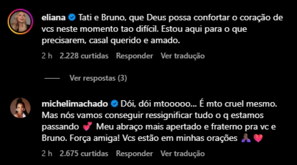 Uma das pessoas que deixou uma mensagem de apoio para a jornalista e o marido foi a apresentadora Eliana. “Tati e Bruno, que Deus possa confortar o coração de vocês neste momento tão difícil. Estou aqui para o que precisarem, casal querido e amado”, disse ela. Sabrina Sato também se solidarizou com a dor dela. “Tati e Bruno… eu sinto tanto por vocês. Todo amor e abraços do mundo. Rezo todos os dias pra vocês”, contou ela.