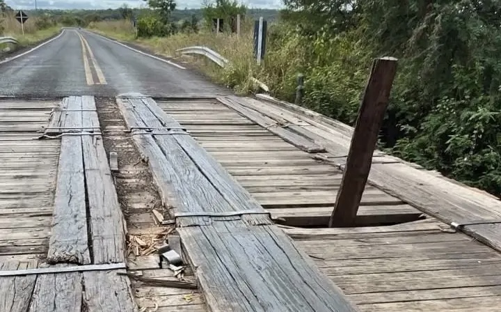 Imagens feitas por moradores mostram tábuas quebradas, buracos na pista e partes da estrutura comprometidas. A ponte é usada por moradores e produtores rurais da região.