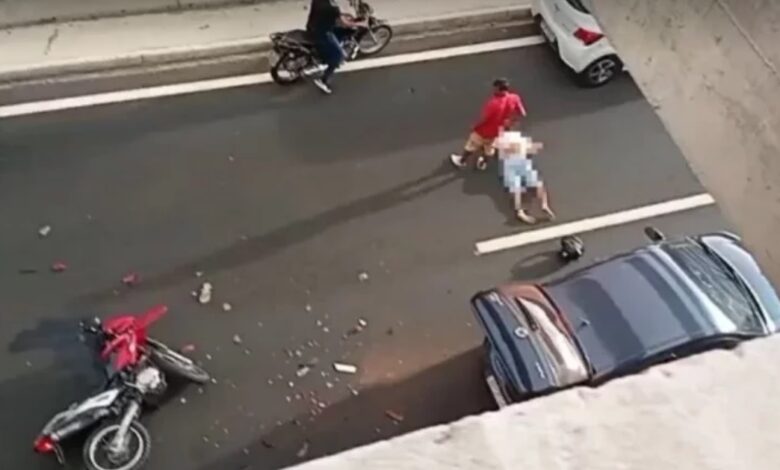 Imagens feitas por populares mostram a vítima caída ao chão, ao lado do capacete. O trânsito ficou lento na região durante o atendimento à ocorrência