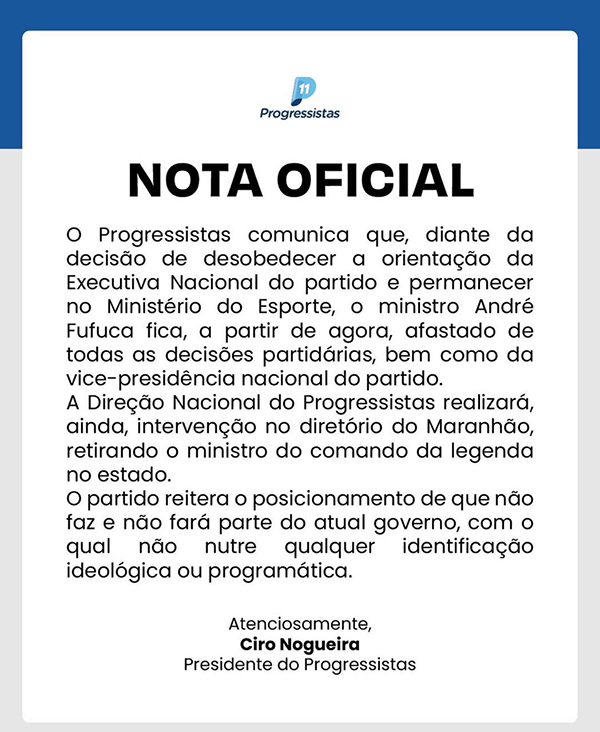 Em nota, Ciro destaca: “diante da decisão de desobedecer a orientação da Executiva Nacional do partido e permanecer no Ministério do Esporte, o ministro André Fufuca fica, a partir de agora, atastado de todas as decisões partidárias, bem como da vice-presidência nacional do partido”.