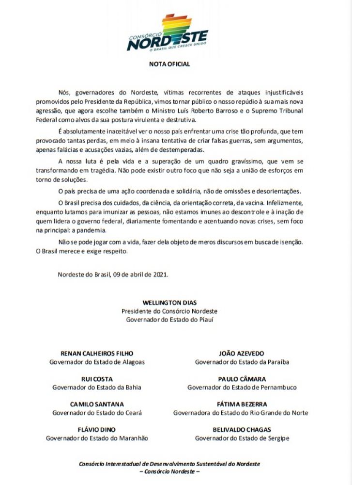 Os nove governadores dos estados do Nordeste, liderados pelo governador do Piauí e presidente do Consórcio Nordeste, Wellington Dias, assinaram uma nota de repúdio ao presidente da república, Jair Bolsonaro, nesta sexta (9). A nota faz menção aos recorrentes ataques sofridos pelos gestores e também ao recente ataque ao Ministro do Supremo Tribunal Federal, Luís Roberto Barroso.