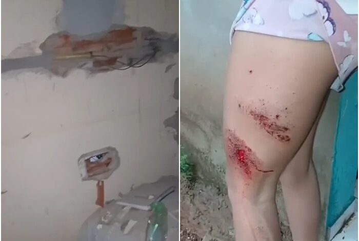 Em vídeo que circula nas redes sociais, uma pessoa mostra os estragos deixados pela descarga elétrica na residência: com piso, parede e lâmpada estourados, estragos pelo local e os ferimentos na perna e no abdômen que a moradora sofreu quando estava no sofá.