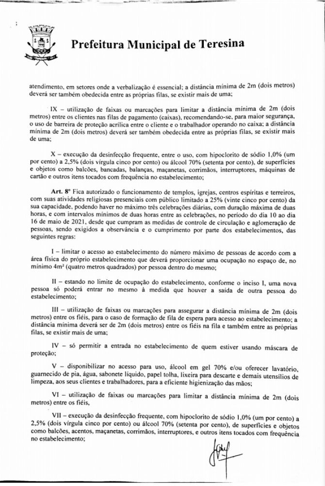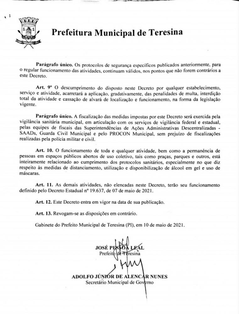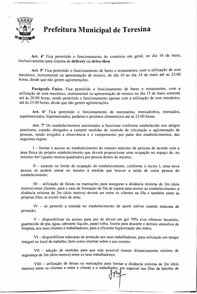 O prefeito de Teresina, Doutor Pessoa, editou nesta segunda-feira (10), decreto nº 20.967, regulamentando o funcionamento do comércio na capital, no período de 10 a 16 de maio.