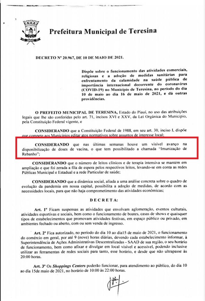 O que chamou atenção no decreto foi a determinação da Prefeitura de Teresina em afirmar que há uma ‘imunização de rebanho na capital’. O motivo seria o avanço da disponibilização de doses de vacina.