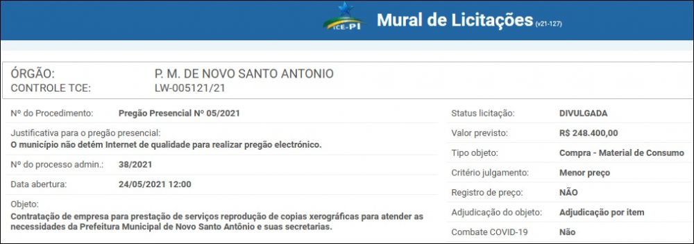A prefeitura de Novo Santo Antônio, no Norte do Piauí, vai realizar no dia 24 de maio de 2021, a abertura de licitação para contratação de empresa para prestação de serviços reprodução de copias xerográficas para atender as necessidades da gestão e suas secretarias.