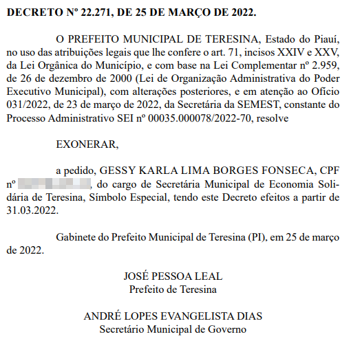 O prefeito Dr Pessoa exonerou Gessy Fonseca da Secretária Municipal de Economia Solidária de Teresina. Ela deu o passo inicial do primeiro escalão do secretariado da Prefeitura de Teresina que deve deixar a gestão para concorrer às eleições de 2022.