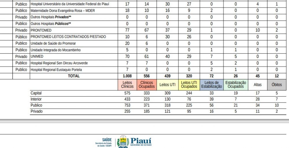 Ou seja, e, Teresina, 65 leitos de UTI estavam vagos e no interior 54 leitos, totalizando 119 leitos de UTI desocupados no dia de ontem.