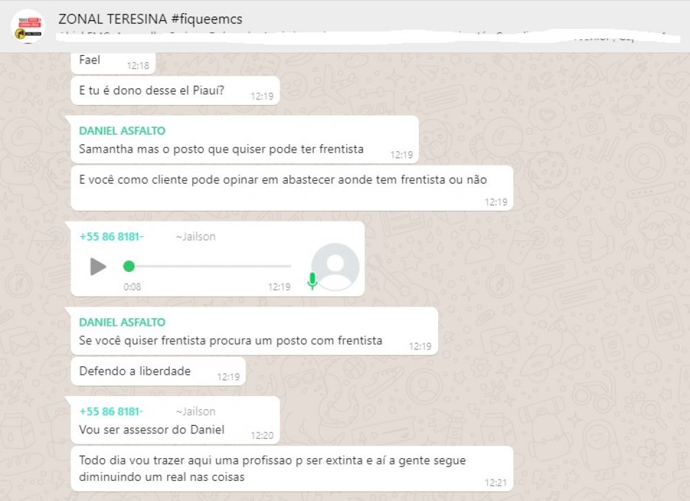 Um participante do grupo identificado como Jaílson completou o comentário. “Vou ser assessor do Daniel. Todo dia vou trazer aqui uma profissão para ser extinta e aí a gente segue diminuindo um real nas coisas. Hoje a gente extingue os frentistas, amanhã pode ser os caixas. Aí a gente diminui 1 real ou 50 centavos de economia nas coisas”, publicou.
