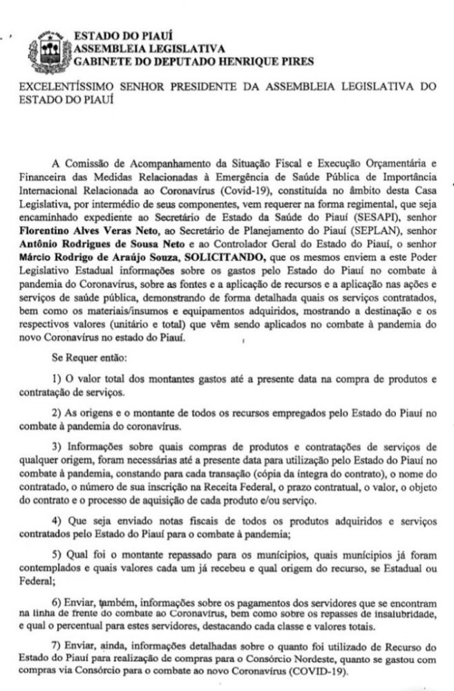 Somente agora , 20 dias depois de aprovado, o governo Wellington Dias recebeu o ofício da comissão de deputados estaduais que prometeu fiscalizar os gastos da Covid-19.