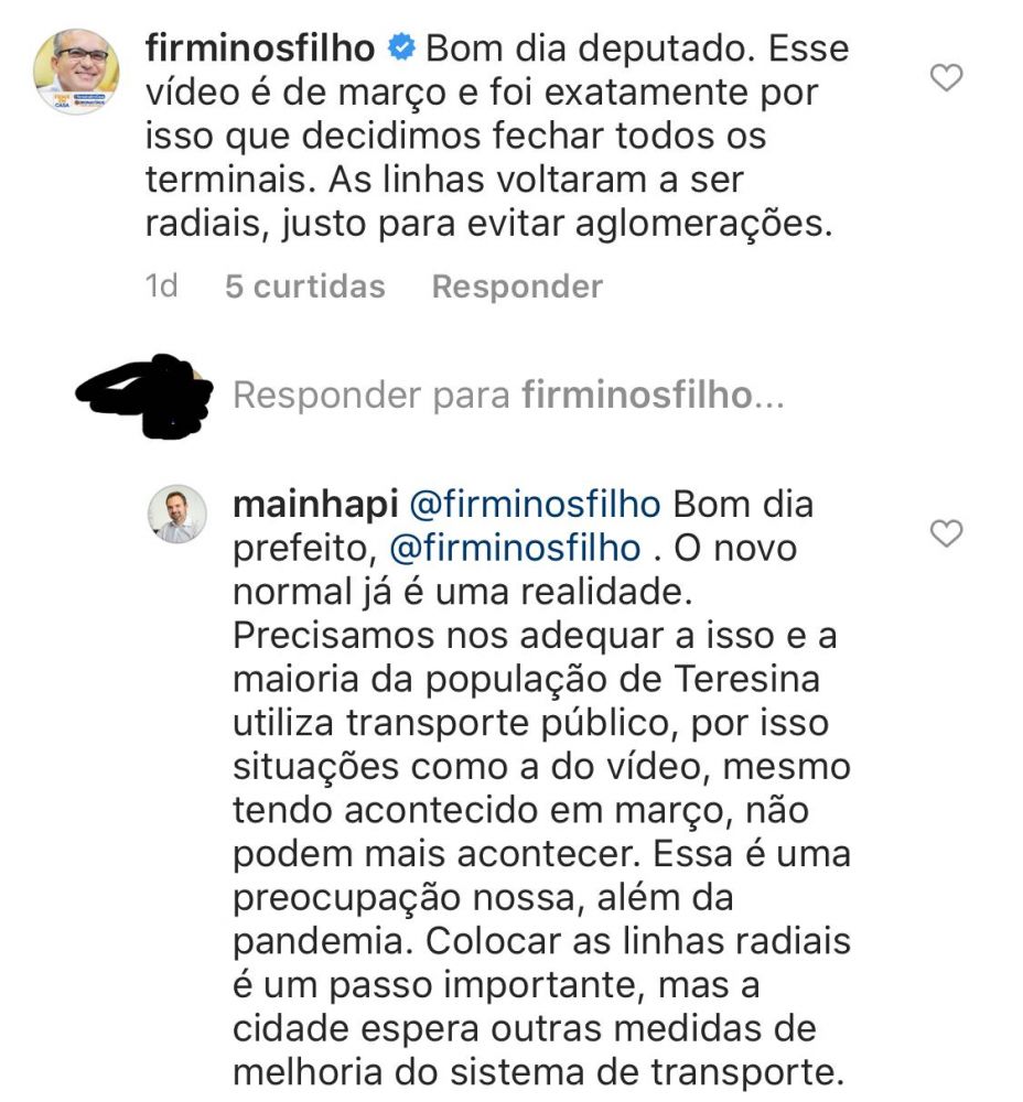Pouco depois o perfil oficial do prefeito respondeu. “Bom dia deputado. Esse vídeo é de março e foi exatamente por isso que decidimos fechar todos os terminais. As linhas voltaram a ser radiais, justo para evitar aglomerações”, respondeu Firmino.