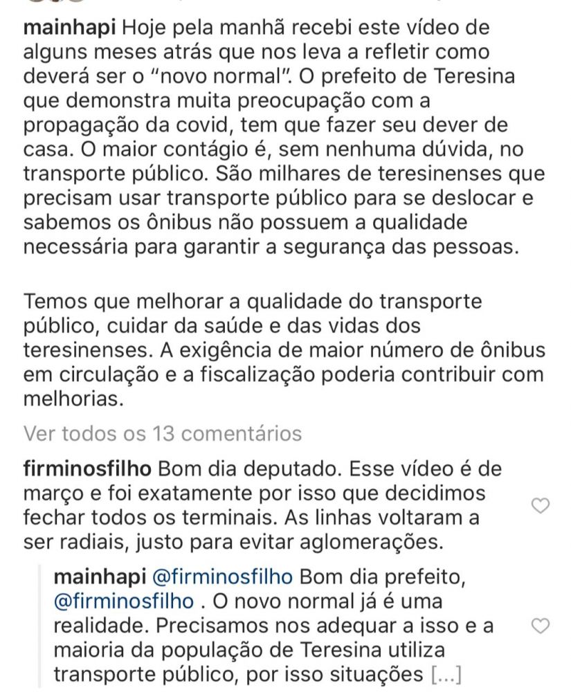 “Temos que melhorar a qualidade do transporte público, cuidar da saúde e das vidas dos teresinenses. A exigência de maior número de ônibus em circulação e a fiscalização poderia contribuir com melhorias”, disse no post.