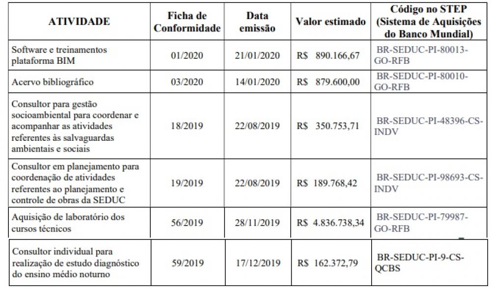 As demais atividades do Plano de Aquisições da SEDUC que ainda não foram solicitadas Fichas de Conformidade a SEPLAN também deverão ser contratadas com os