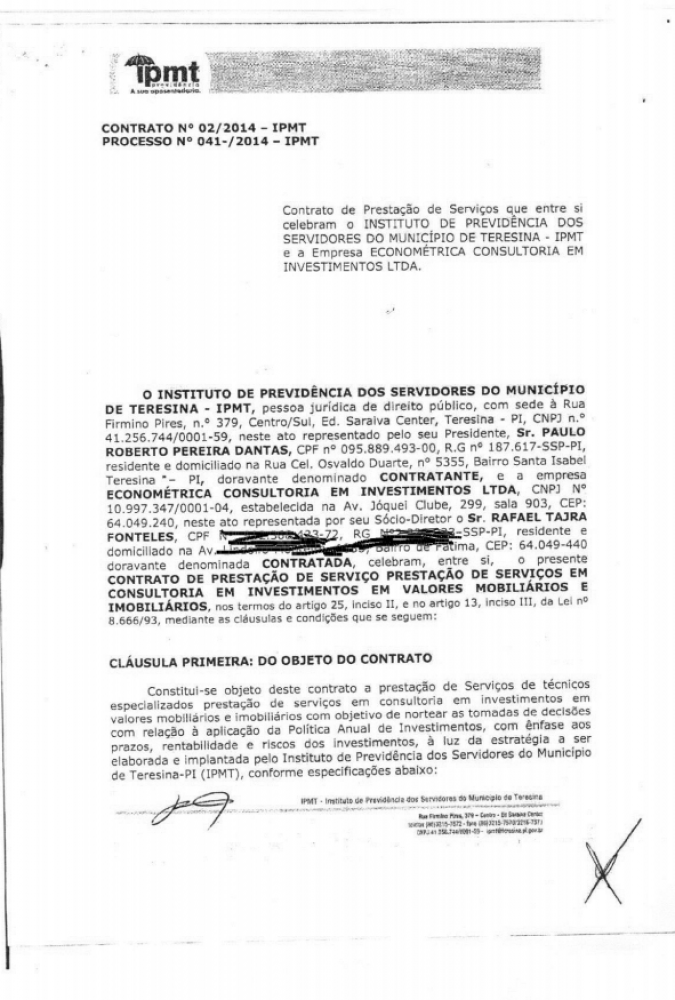 O site que monitora os contratos dos Regimes Próprios de Previdência Social, o www.rppstransparencia.com, informou em sua lista que os pagamentos mensais de R$ 88 mil do IPMT para a empresa Econométrica representam o segundo maior contrato do país das consultorias de investimentos dos regimes de previdência dos entes públicos. Na lista ainda consta o nome do responsável como sendo Rafael Fonteles, que está licenciado da empresa.