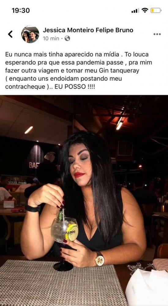 “Eu nunca mais tinha aparecido na mídia. To louca esperando pra que essa pandemia passe, pra mim fazer outra viagem e tomar meu Gin Tanqueray (enquanto uns endoidam postando meu contracheque). EU POSSO!!!”, postou ela.