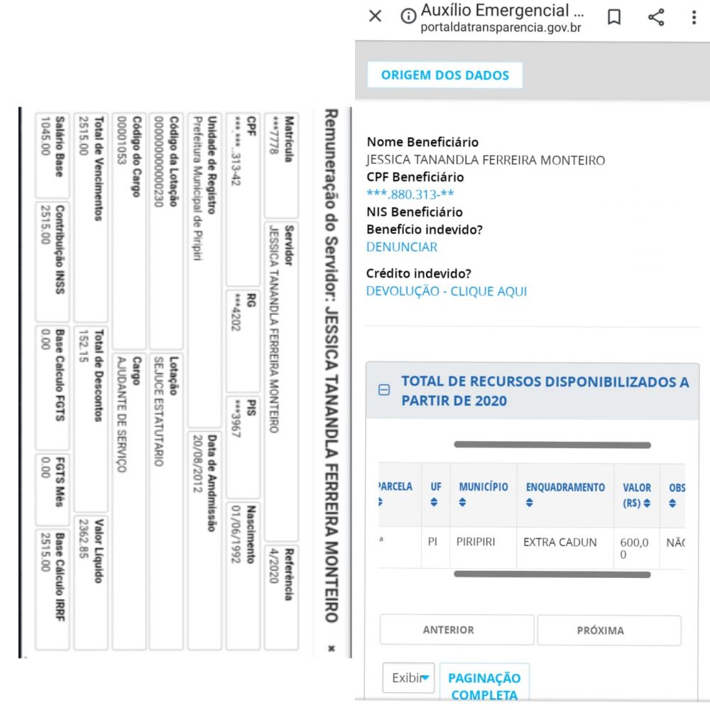 A servidora Jéssica Tanandla Ferreira Monteiro, da Prefeitura do município de Piripiri, com contracheque de R$ 2515,00 solicitou e recebeu o Auxílio Emergencial do Governo Federal.