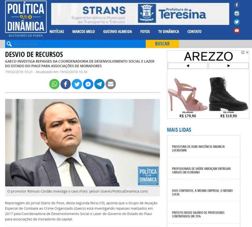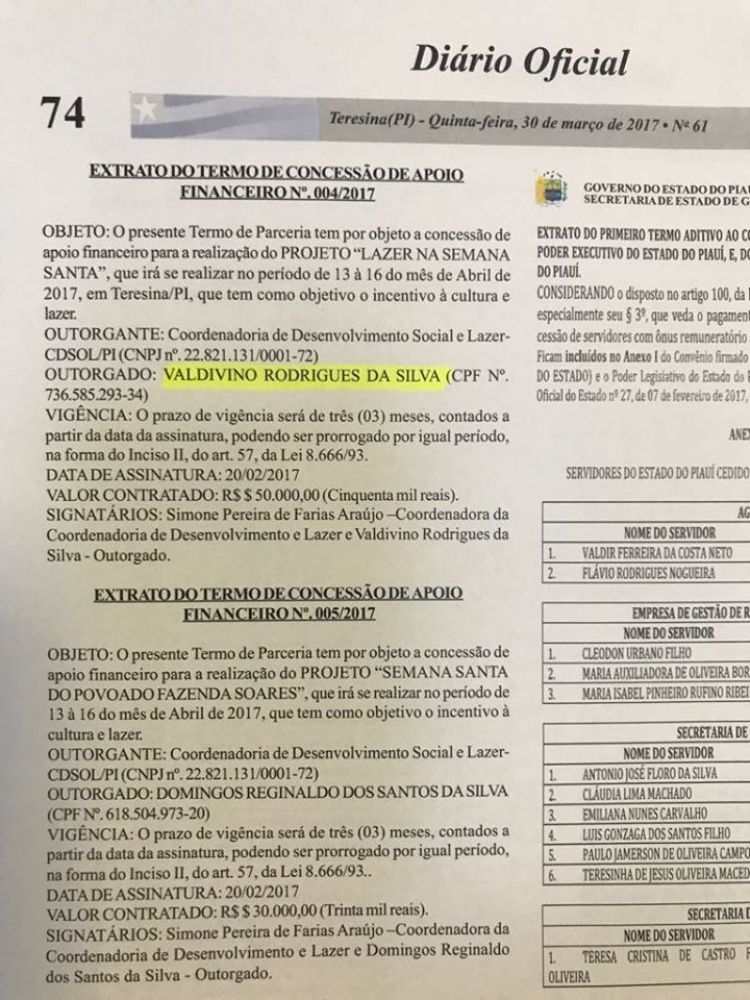 Na ocasião, o Diário Oficial do Piauí publicou Extrato do Termo de Concessão de Apoio Financeiro nº 004/2017. O documento mostra que a CDSOL repassou para Valdivino o valor de R$ 50 mil, que deveria ser empregado na realização do projeto “Lazer na Semana Santa”, que aconteceria entre 13 e 16 de abril de 2017, em Teresina.