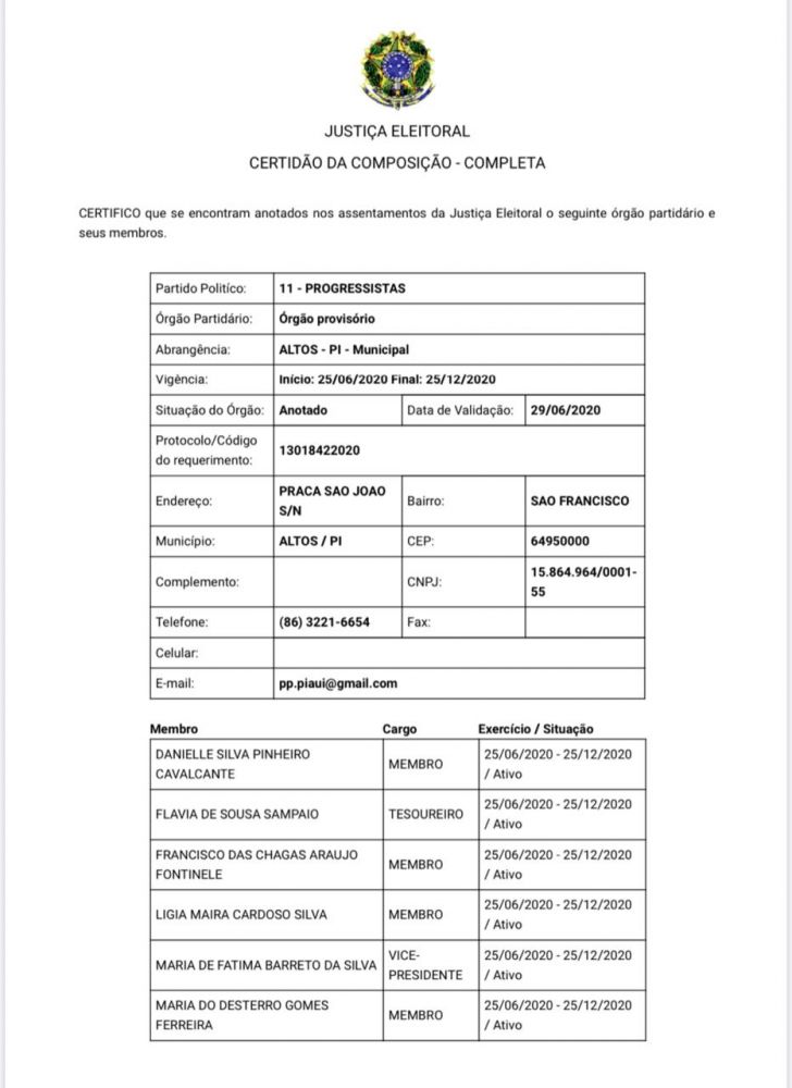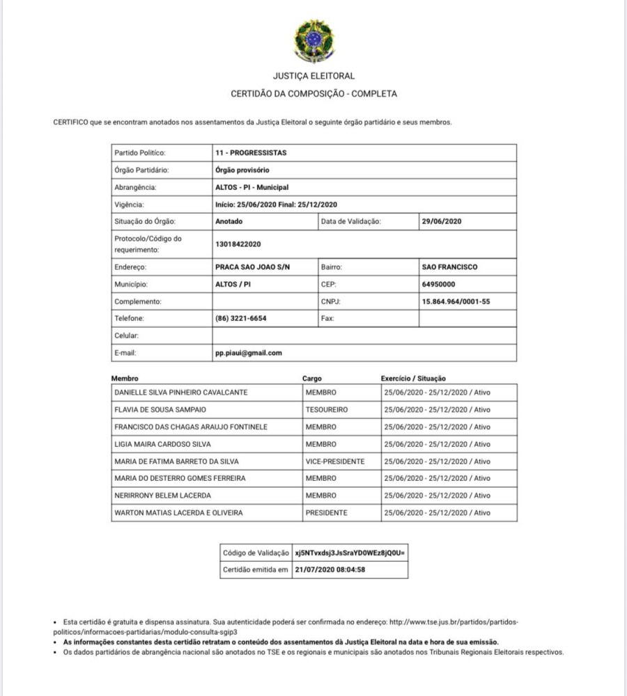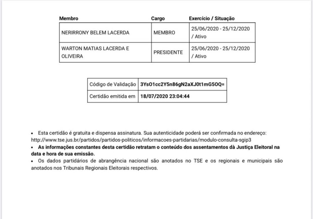 De acordo com a Justiça Eleitoral, Warton Lacerda é presidente entre o período de 25/06 até 25/12 de 2020. A vice-presidente é Maria de Fátima Barreto da Silva.