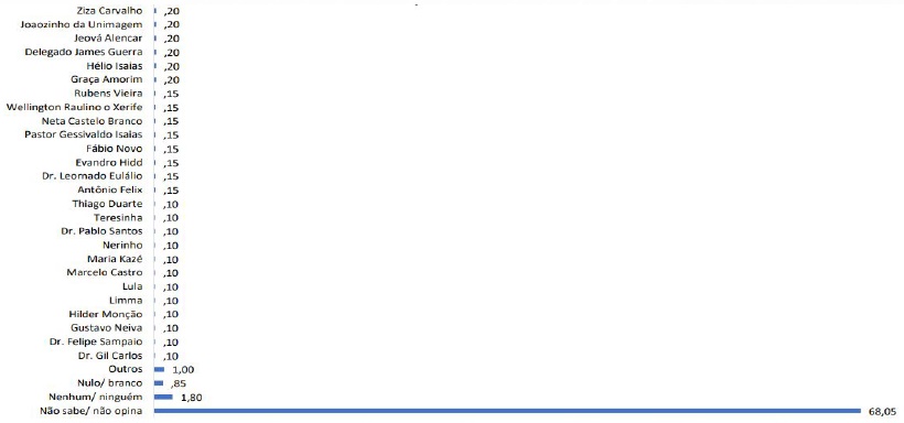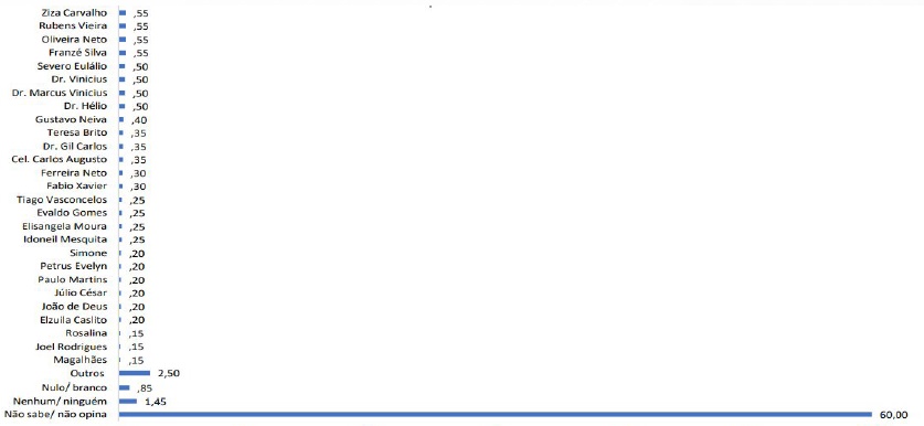 No levantamento para deputado estadual, Georgiano (MDB) foi citado por 2,5%, Gracinha Mão Santa (PP) por 1,9% e Janaínna Marques (PT) por 1,45%.