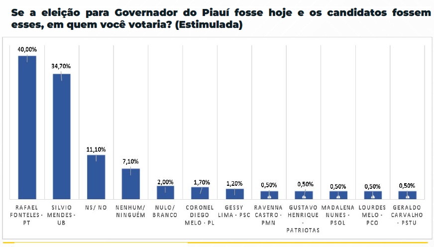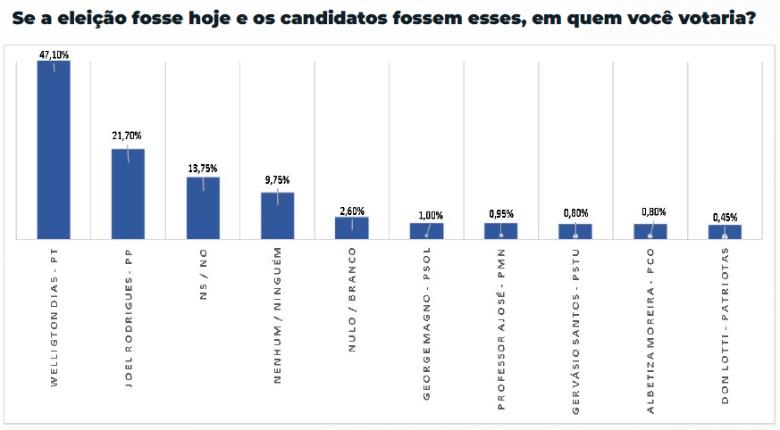 47,10% afirma que deve votar em Wellington Dias (PT) e 21,7% em Joel Rodrigues (PP). 13,75% dos eleitores disse que não sabia ou preferiu não opinar. 9,75% que não votaria em ninguém e 2,6% disse que vota em branco ou nulo.