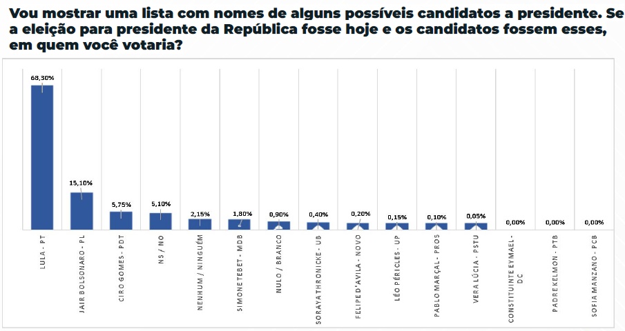 Lula (PT) foi citado por 65,6% dos entrevistados enquanto 14,35% disse votar em Jair Bolsonaro (PL). 12,65% disse que não sabia ou preferia não opinar. Logo em seguida aparece Ciro Gomes (PDT) com 4,35%. Nenhum ou ninguém soma 1% e os demais candidatos pontuaram menos de 1% cada.