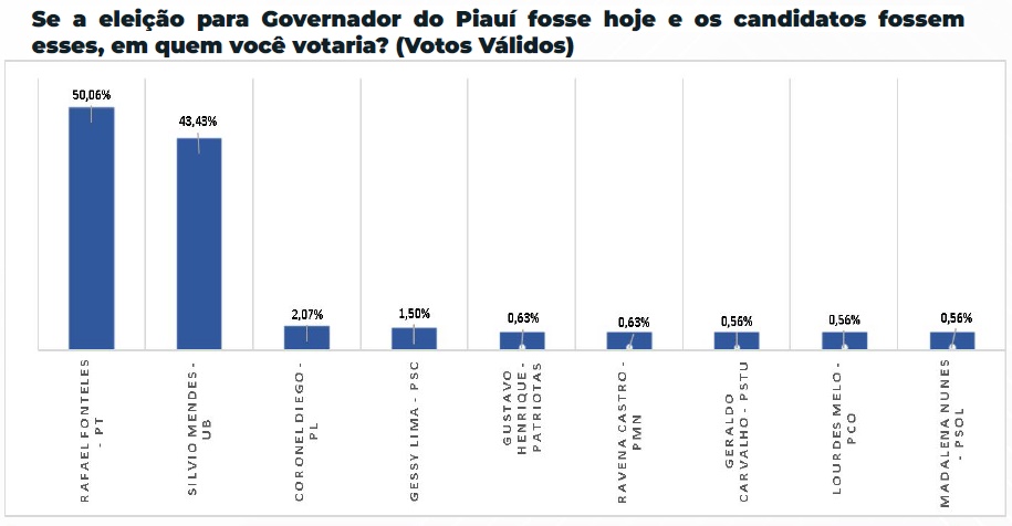 Pesquisa divulgada pelo IPPI Pesquisas e Consultoria revelam que o candidato a governador do Piauí Rafael Fonteles (PT) deve ganhar a eleição de 2022 ainda no primeiro turno, de acordo com o cálculo de votos válido, superando os 50% das intenções de voto.