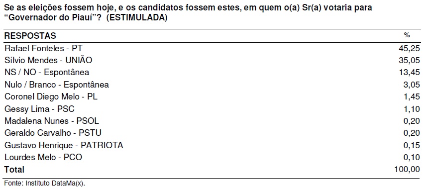Nova pesquisa do Instituto Datamax mostra que o candidato do PT, Rafael Fonteles, está liderando a disputa pelo Governo do Piauí e deve ganhar a eleição ainda no primeiro turno.