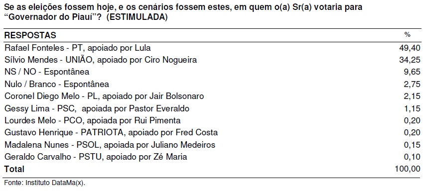 A pesquisa revela ainda que, com o apoio de Lula, Rafael aparece com 49,4% das intenções de voto contra 34,25% de Silvio Mendes apoiado por Ciro Nogueira. Veja mais dados: