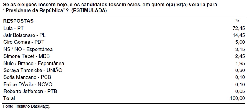 Lula (PP) aparece em primeiro lugar nas intenções de voto com 72,45%, contra 14,45% de Jair Bolsonaro (PL). Veja as demais citações: